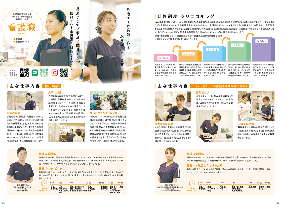医療・福祉系の採用パンフレットということで、親しみやすさと優しさをコンセプトに提案。業務内容以外に職員のリアルな一日を記事にまとめ、各部門の現場のイメージが伝わりやすい内容にしました。